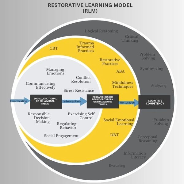 The Restorative Learning Model (RLM) is an Educational Therapy developed that combines the principles of research-based behavioral theories and frameworks with cognitive competencies to strengthen a youth’s ability to respond appropriately socially, emotionally, and behaviorally.